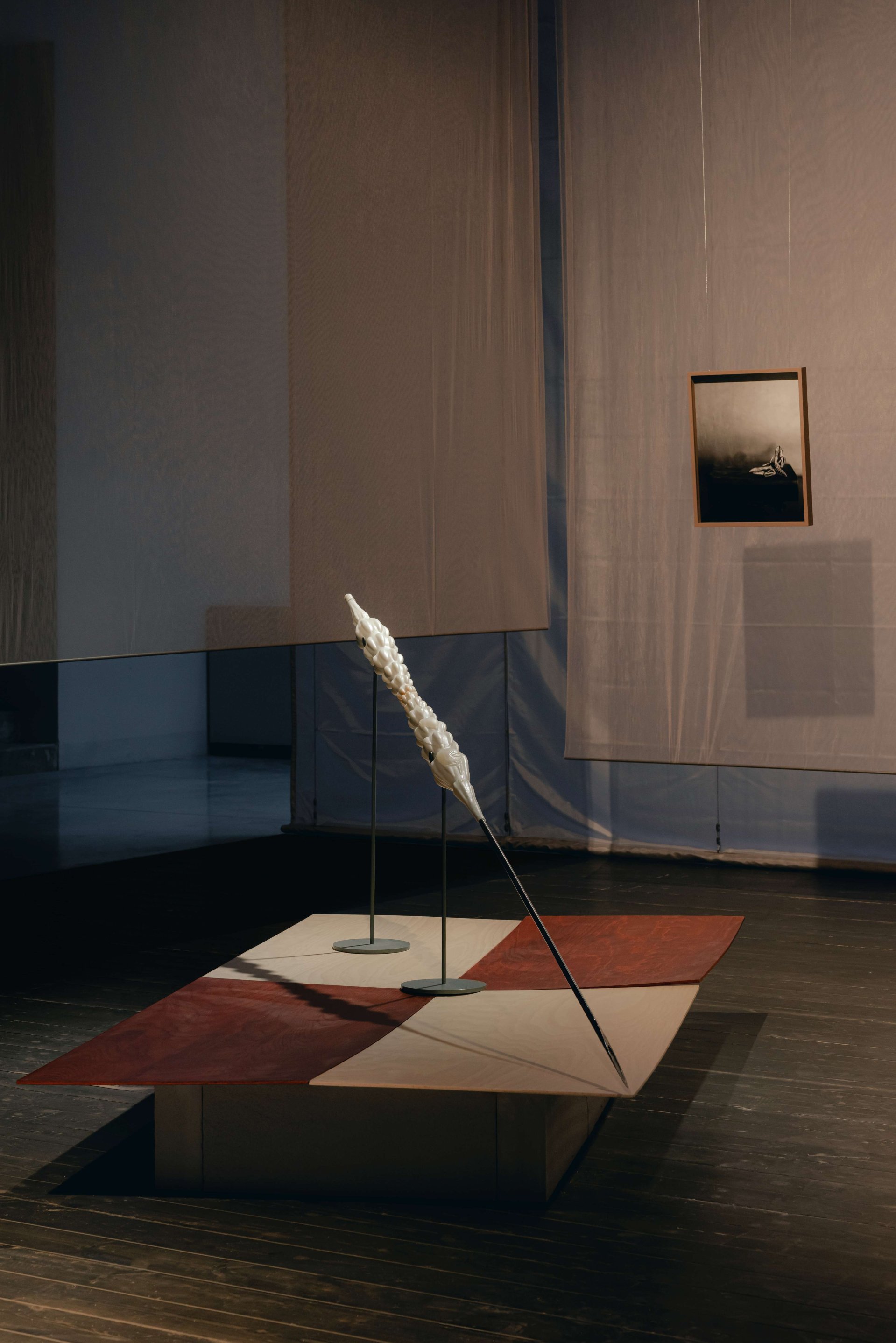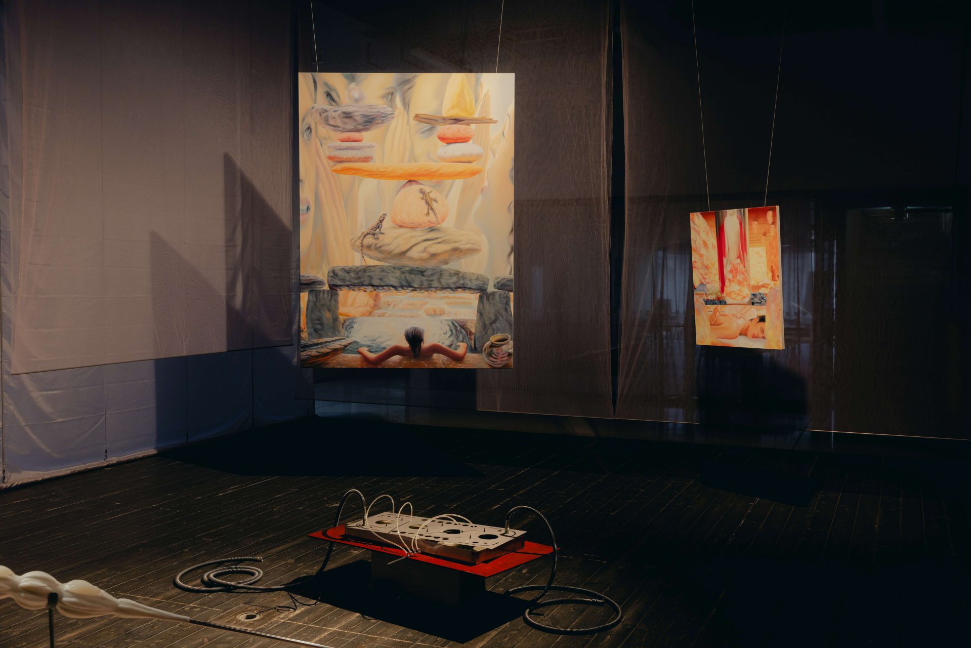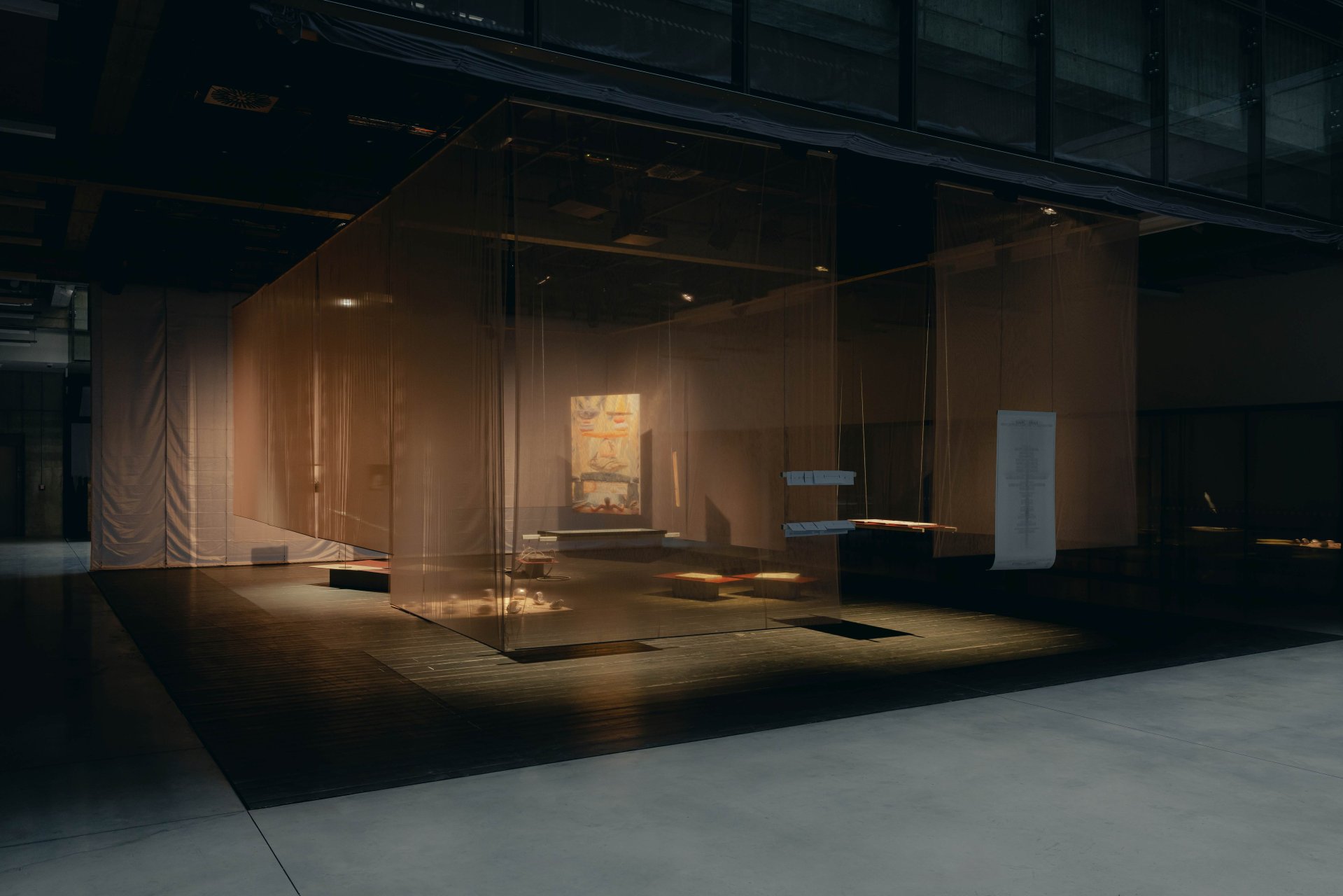 Poslání výstavy a samotná díla podtrhuje instalace studujících Ateliéru architektury II UMPRUM Adama Rýznara a Sofie Gjuričové. Expozici ohraničují poluprostupnou a prosvítající stěnou z tylové látky starorůžové barvy navozující pocit iluzorního bezpečí.