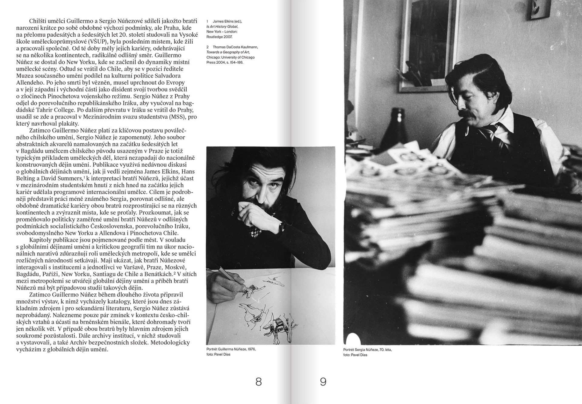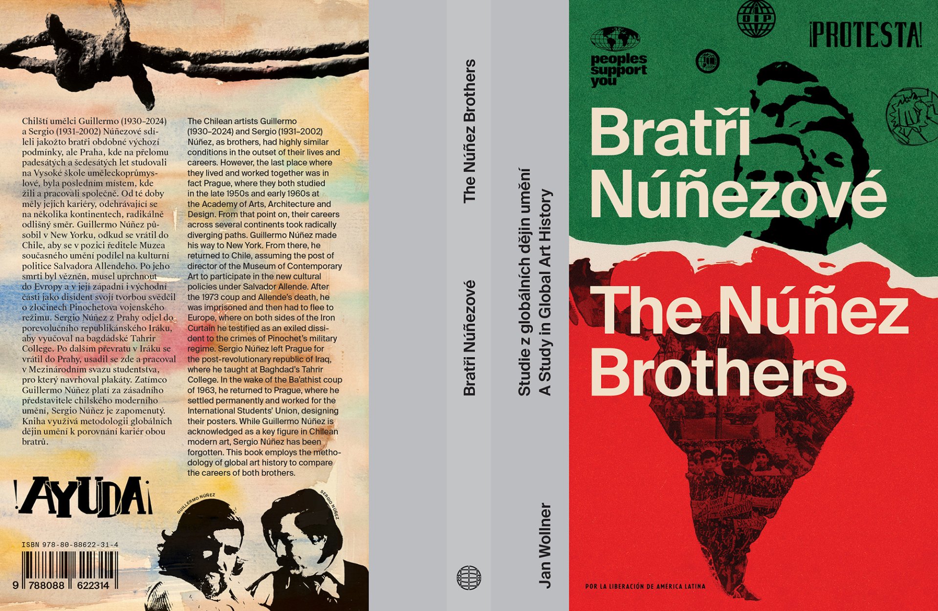 Chilští umělci Guillermo (1930–2024) a Sergio (1931–2002) Núñezové sdíleli jakožto bratři obdobné výchozí podmínky, ale Praha, kde na přelomu padesátých a šedesátých let studovali na Vysoké škole uměleckoprůmyslové, byla posledním místem, kde žili a pracovali společně. Od té doby měly jejich kariéry, odehrávající se na několika kontinentech, radikálně odlišný směr. Guillermo Núñez působil v New Yorku, odkud se vrátil do Chile, aby se v pozici ředitele Muzea současného umění podílel na kulturní politice Salvadora Allendeho. Po jeho smrti byl vězněn, musel uprchnout do Evropy a v její západní i východní části jako disident svojí tvorbou svědčil o zločinech Pinochetova vojenského režimu. Sergio Núñez z Prahy odjel do porevolučního republikánského Iráku, aby vyučoval na bagdádské Tahrir College. Po dalším převratu v Iráku se vrátil do Prahy, usadil se zde a pracoval v Mezinárodním svazu studentstva, pro který navrhoval plakáty. Zatímco Guillermo Núñez platí za zásadního představitele chilského moderního umění, Sergio Núñez je zapomenutý. Kniha využívá metodologii globálních dějin umění k porovnání kariér obou bratrů. Vychází česko-anglicky za podpory Ministerstva kultury ČR v rámci projektu NAKI III / Místa tvořivosti* / Uměleckoprůmyslové vzdělávání – konstrukce identit, záchrana minulosti a design budoucnosti. Grafika František Polák. Kniha doprovází stejnojmennou výstavu v Galerii UM na UMPRUM (24. 10. 2025–21. 12. 2025).