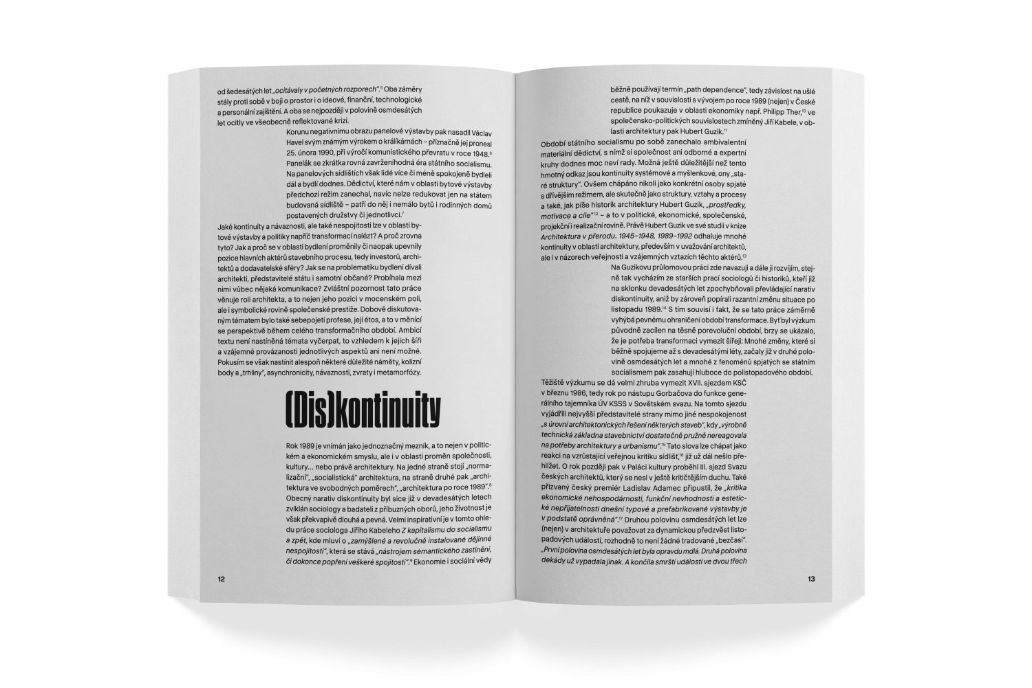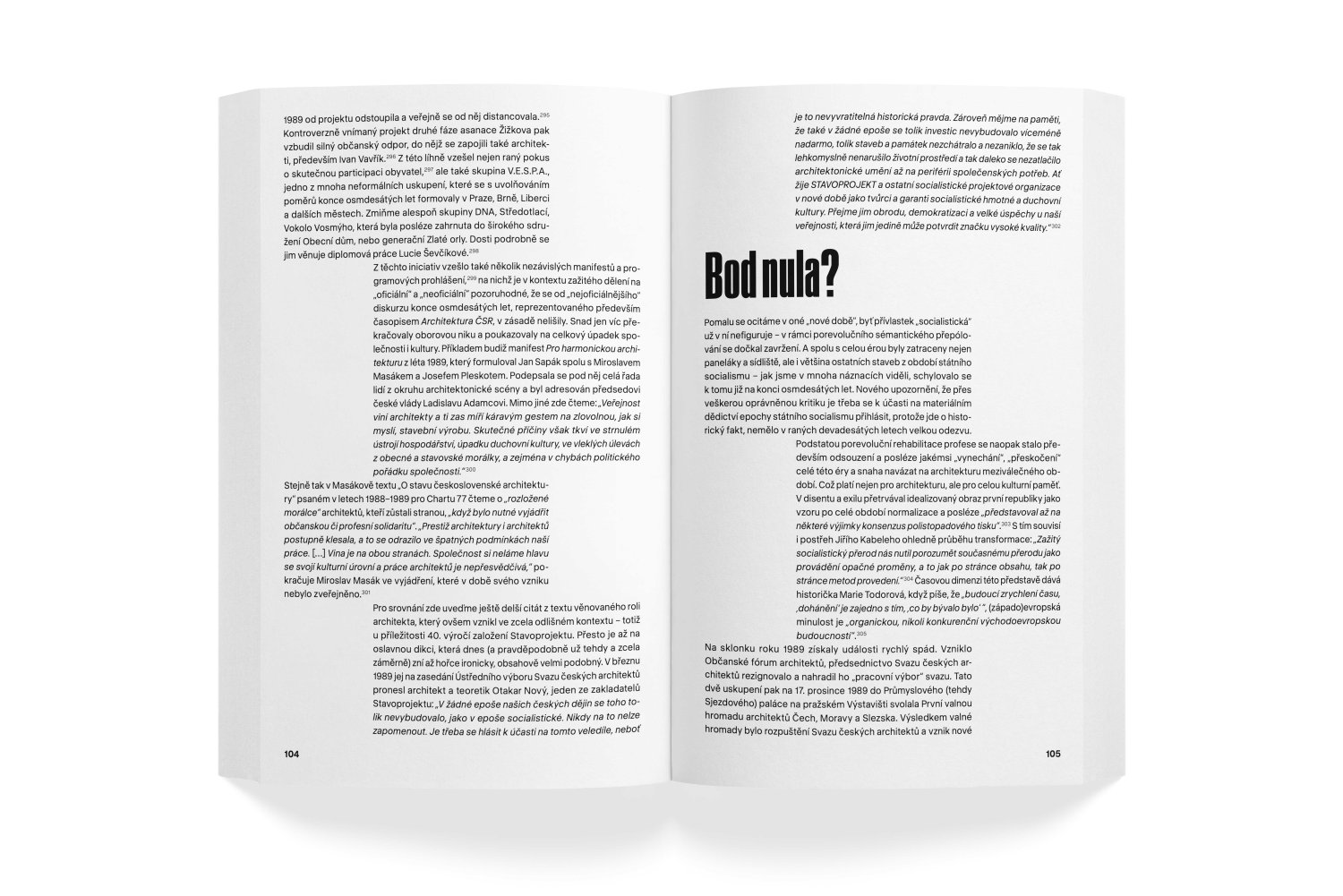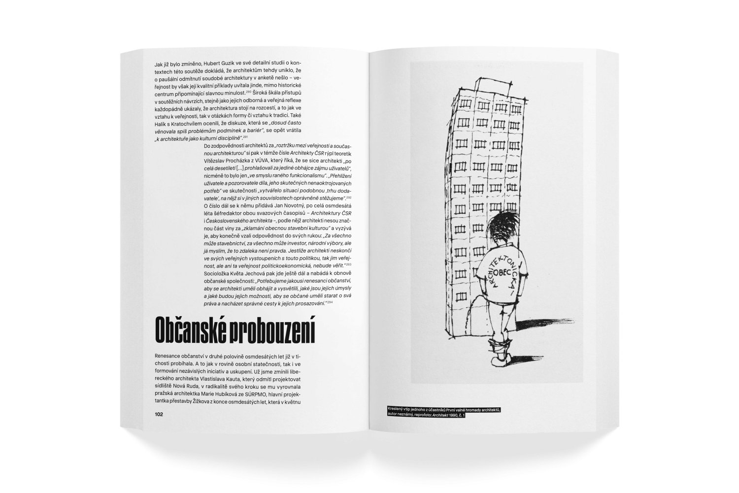 Tématem knihy Karoliny Jirkalové jsou vzájemné vztahy, překryvy a konflikty mezi českou architekturou, politikou a společností na sklonku státního socialismu a v prvních letech po sametové revoluci. Zabývá se proměnou rolí a mocenských pozic jednotlivých aktérů veřejné diskuse i stavebního procesu – architektů, státu (úřadů a legislativy), investorů a uživatelů a v neposlední řadě dodavatelské sféry a také jejich vazeb, sítí a koalic. Byť je rok 1989 bezpochyby výrazným přelomem, kontinuity mezi érami, které odděluje, jsou v oblasti architektury, urbanismu, stavební reality i bytové politiky přinejmenším stejně silné jako diskontinuity, byť třeba mají jinou dynamiku. I dějinné nespojitosti mají mnohdy společný obsah, jen opačné znaménko. Práce se snaží zachytit a interpretovat specifický „mezičas“ přerodu české architektury, který lze situovat přibližně do let 1986–1994. Grafika Anežka Hrubá Ciglerová, Richard Wilde (publikum.design).