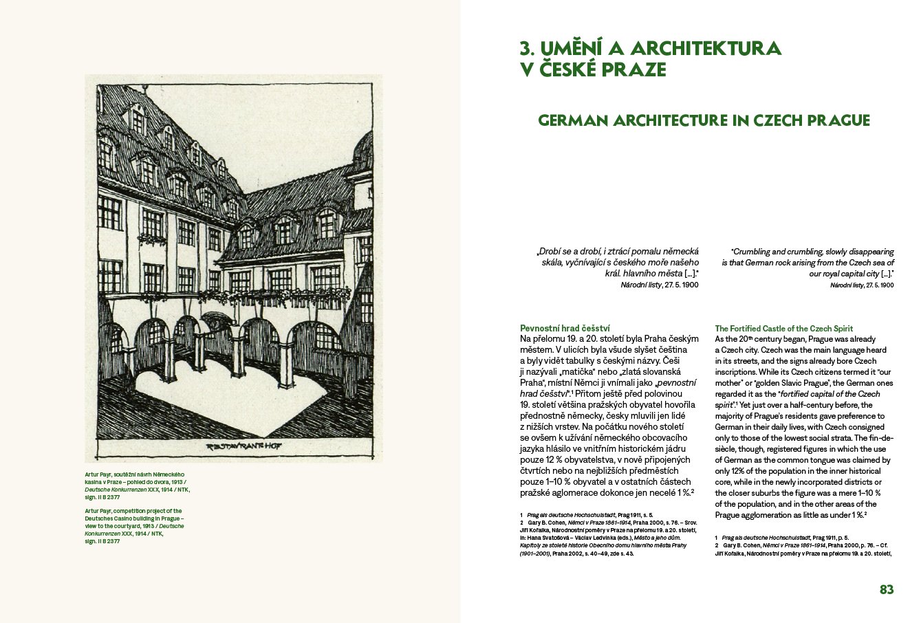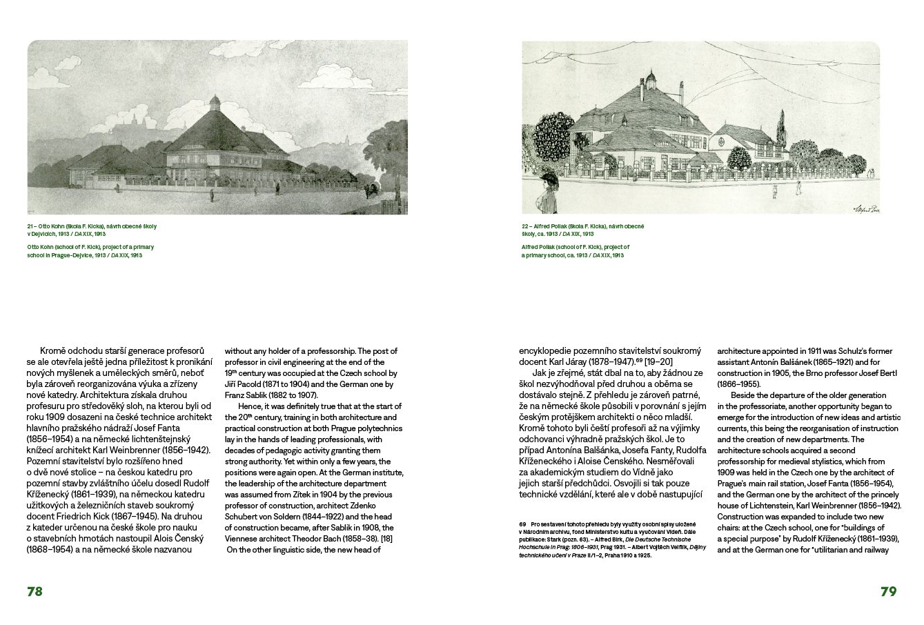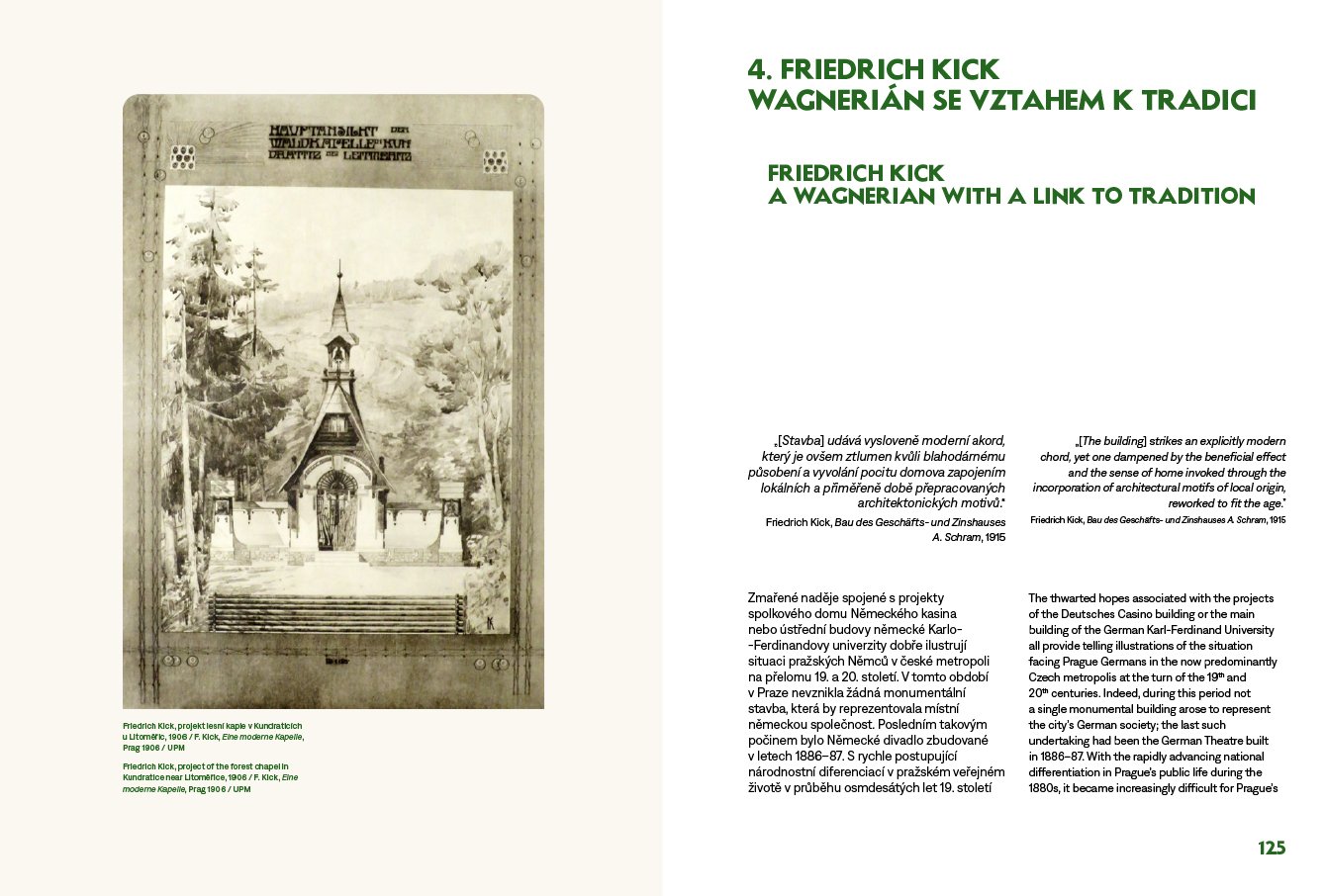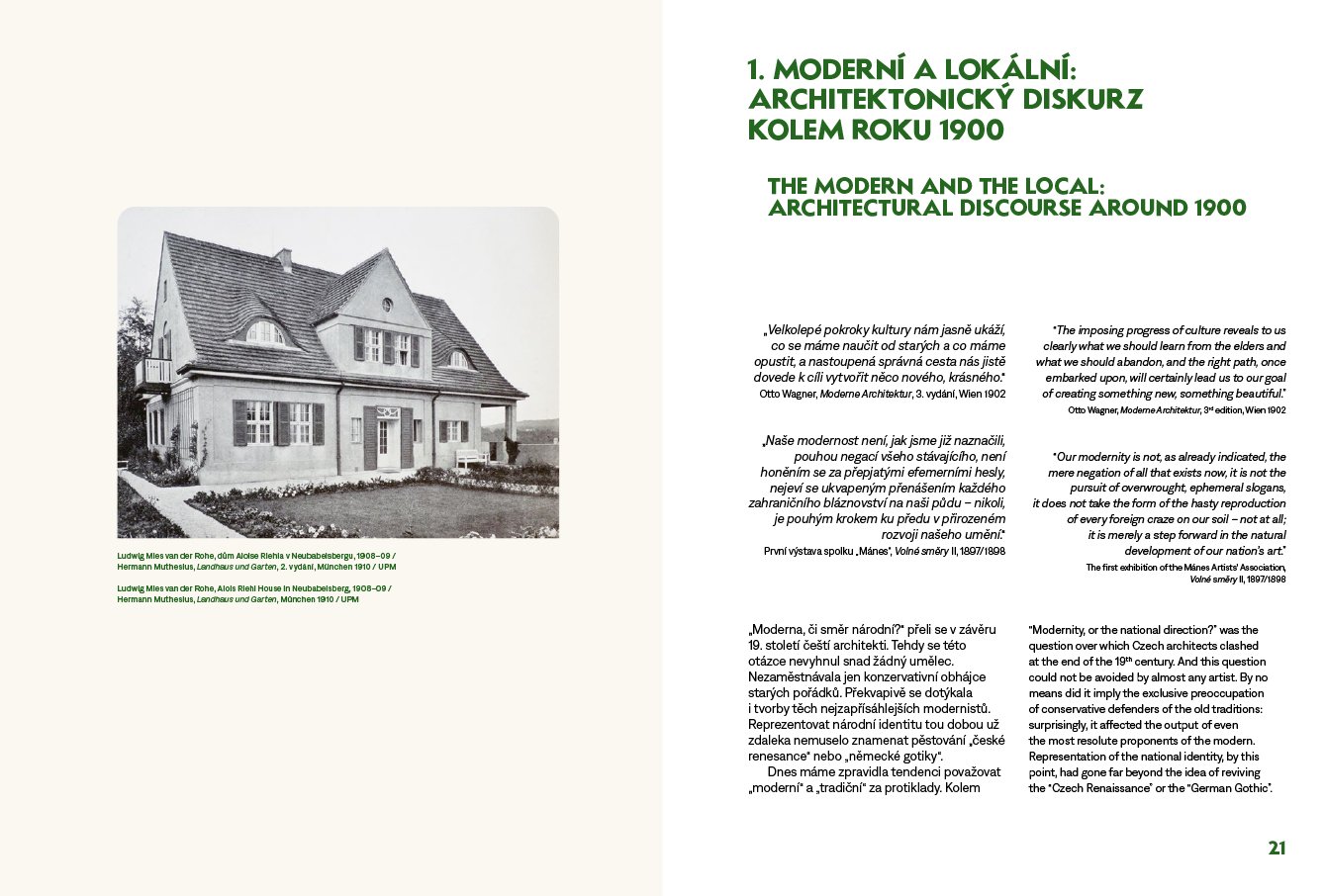 Kolem roku 1900 se na umělecké scéně v Čechách prosazuje moderna. Proces české národní emancipace vrcholí a sebevědomé české umění se více otevírá západnímu světu. Oproti tomu němečtí umělci v Čechách, náležící dosud k širokému německému kulturnímu okruhu, si svou osobitou identitu teprve začínají uvědomovat. Soupeří tak s českými kolegy, kdo se jako první zařadí do mezinárodního rozvoje moderny, ale zároveň je pro jejich tvorbu důležitá vlastní svébytnost a přináležitost ke kulturní tradici české země. Jak se tyto na první pohled neslučitelné intence projevily v tehdejší architektonické produkci? Dnes máme tendenci nazírat architekturu českých Němců ve srovnání s českou tvorbou jako méně moderní. Není ale tento pohled zkreslen naší snahou sledovat v českém umění v první řadě projevy modernosti, kdežto v umění českých Němců si všímáme především dokladů nacionalismu a tradicionalismu? Úkolem této knihy není posoudit, nakolik byla tvorba českoněmeckých architektů kolem roku 1900 moderní. Cílem je spíše představit ji jako integrální součást soudobého evropského diskurzu. Chceme ukázat, že za jejím tradicionalismem nemusely stát nacionální intence, ale snaha o návrat k předindustriální jednoduchosti, prostotě a přirozenosti. Moderní architektura přelomu 19. a 20. století měla dvojí tvář: obracela se ke kořenům a přirozené domácí tradici, stejně jako sledovala potřeby nové doby. Jednotlivé kapitoly se věnují nejprve obecnějším otázkám vztahu moderního a tradičního v architektonickém diskurzu kolem roku 1900 a dále probírají problematickou situaci německého umění v Čechách. Následně se kniha zaměřuje na vedoucí osobnosti pražské i regionální českoněmecké architektury, na jejichž tvorbě ukazuje různé způsoby vztahování se k modernímu a lokálnímu. Publikaci provázejí četná vyobrazení sestávající převážně z historických fotografií a archivních materiálů. Grafika Petr Krejzek. Vychází v česko-anglické jazykové mutaci. Výzkum a vydání knihy podpořila v letech 2018–2022 Grantová agentura České republiky (reg. č. projektu 18-04816S, Hledání identity: Architektura českých Němců 1891–1918).
