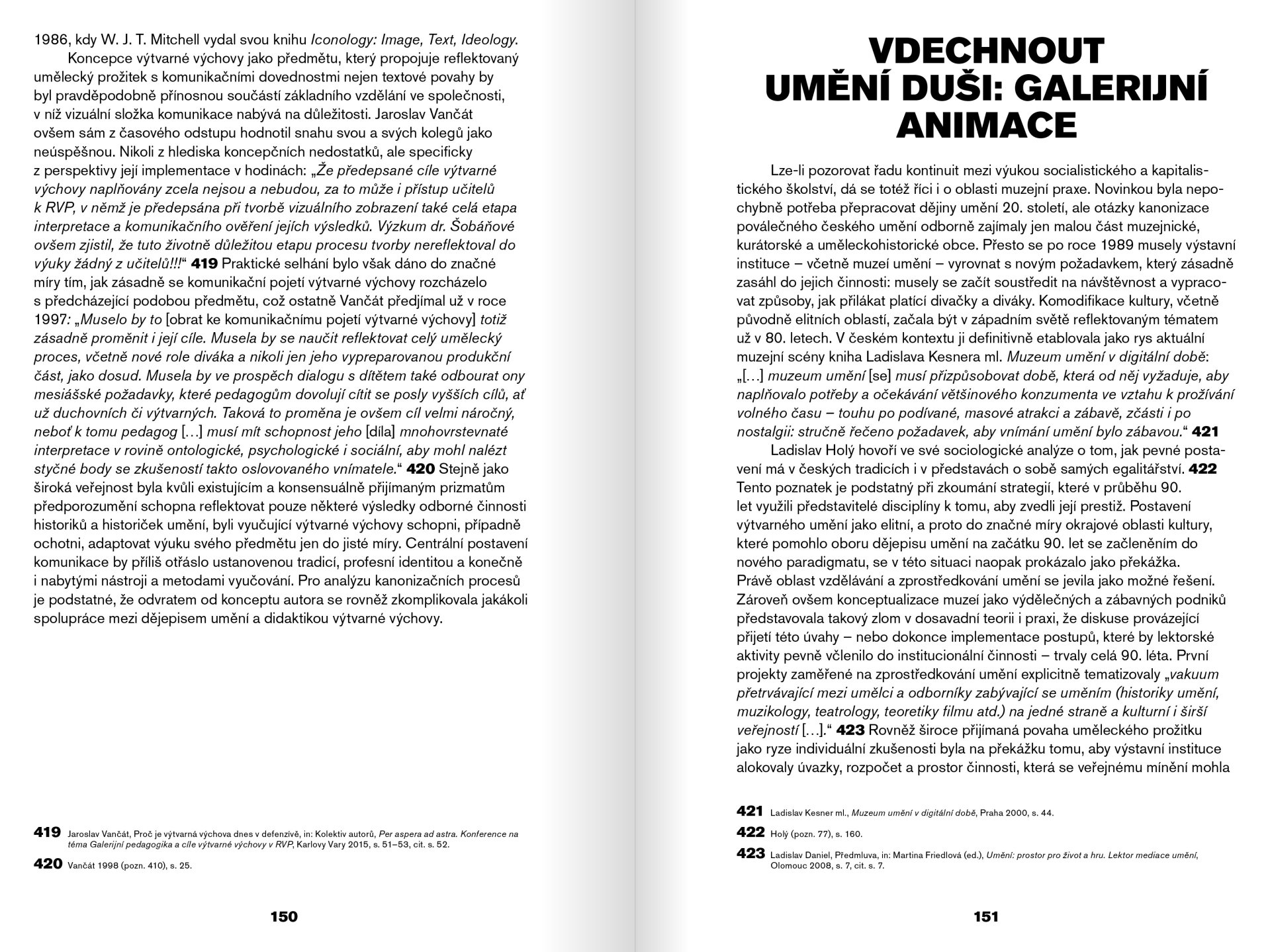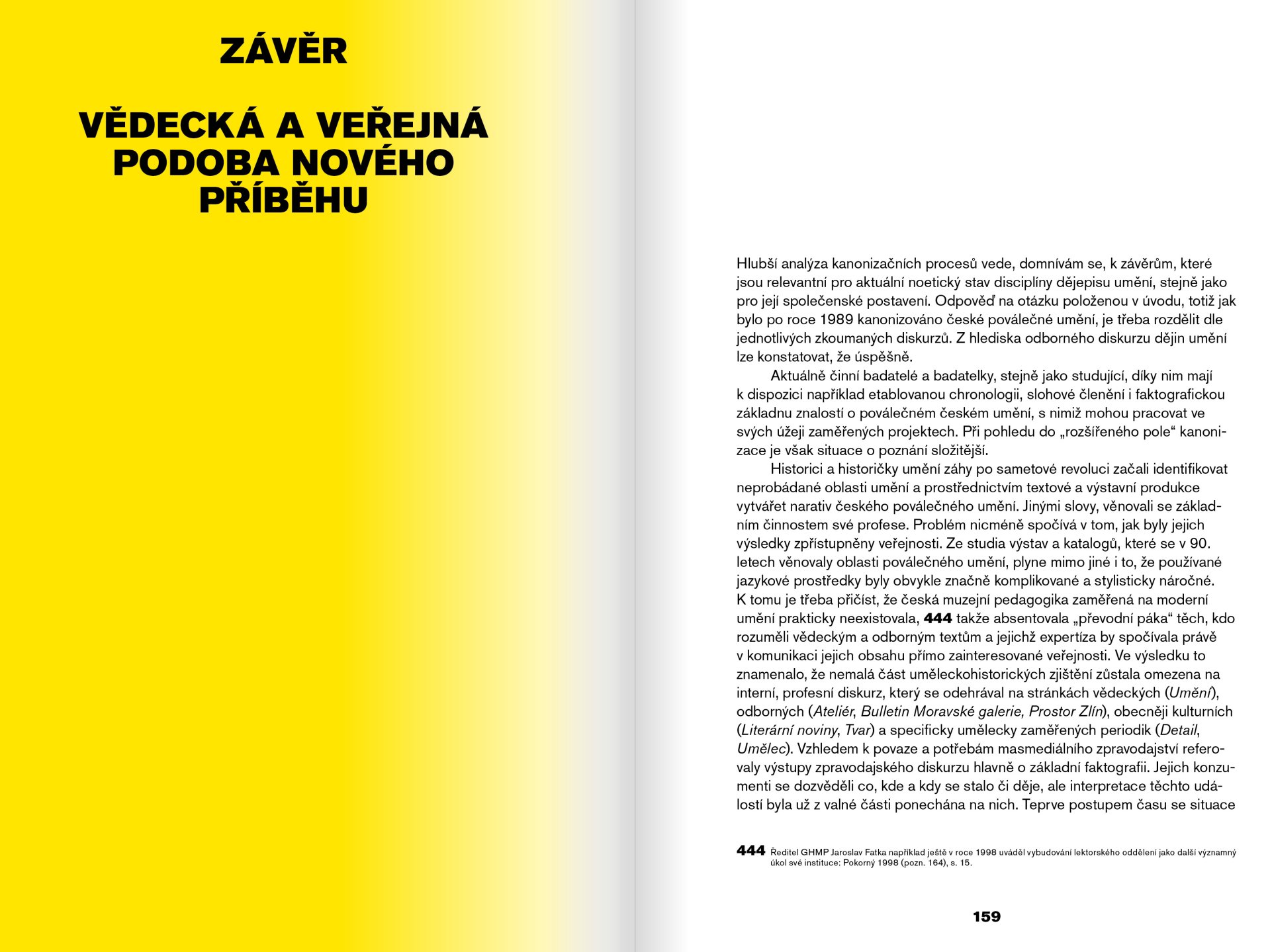 Kniha vycházející z dizertační práce zkoumá dějiny umění z neobvyklé perspektivy: stručně představuje nový příběh dějin umění, který postupně vznikal péčí českých historiček a historiků umění po roce 1989, text se však zaměřuje především na jednotlivé prostředky konstruování nového uměleckohistorického kánonu. Ačkoli tento termín dlouho nepatřil v oborových debatách k nejfrekventovanějším, představuje klíčový prostředek komunikace s veřejností. Kniha zkoumá celkem tři relevantní oblasti. Nejprve stálé expozice, které v průběhu devadesátých let otevírala česká, moravská a slezská muzea výtvarného umění, dále koncepty, jež měla k porozumění nově překládanému narativu dějin umění veřejnost, a konečně otázku, jak bylo poválečné české umění zpracováno v učivu základní školy, zejména v dějepisu a ve výtvarné výchově.