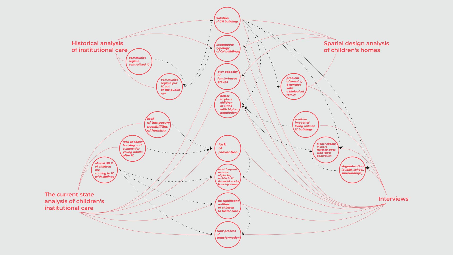 Disertační práce se zabývá rolí architektury v procesu deinstitucionalizace ústavní péče v České republice. Zaměřuje se na ohrožené děti a mladistvé v dětských domovech a výchovných ústavech. Umělecký výzkum kombinuje metody architektonické etnografie, zkoumá historický a současný stav systému dětské ústavní péče, analyzuje právní rámec péče v České republice a dopady nového Zákona o podpoře v bydlení na transformaci péče o ohrožené děti a mladé dospělé. Záměrem doktorské práce je na základě zjištěných skutečností vytvořit ucelený metodický manuál pro poskytovatele péče, státní instituce, místní samosprávy, osoby využívající péči a odborníky a odbornice v oblasti architektury. Manuál má za cíl podpořit prevenci pro snížení počtu dětí odebíraných z biologických rodin do ústavní péče z důvodu bytové nouze, urychlit transformaci ústavní péče o ohrožené děti a přispět k následné péči v bydlení pro mladé dospělé opouštějící ústavní zařízení.