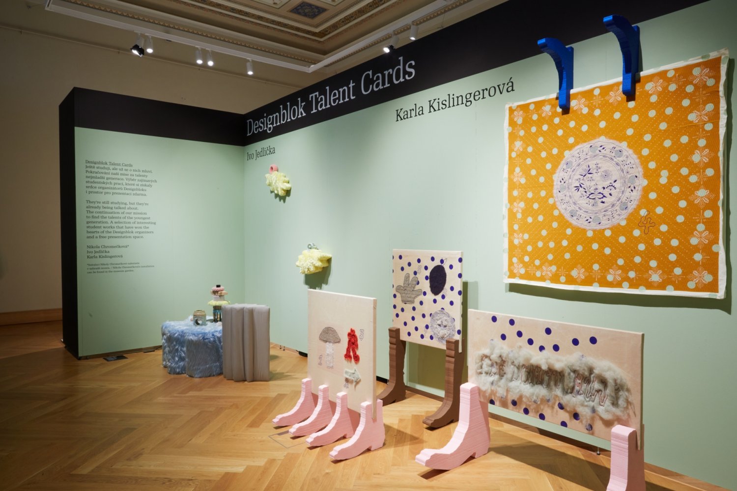 Karla Kislingerová, a student of the Studio of Textile Design, won 2nd place in the Best Home Accessories category with her collection of textile paintings Kde domov můj? (Where is my home?) Karla was inspired by the question of home and large-scale tapestries. The motifs of the paintings themselves were drawn from in-depth research conducted in the field of rich internet discussions and columns, hobby websites and other sources of information about material and immaterial pride of our homeland. The final form of the four paintings uses a technique inspired by the Artprotis method, very popular in the 1970s and 1980s for large-scale works. For the realisation, she chose machine sewing of handmade Czech wool from the Krkonoše Mountains into leftover or damaged textiles from defunct Czech factories found there.