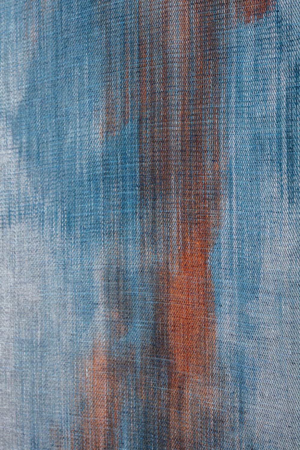 Together with the family-run weaving mill Kubák, Linda Kaplanová and Klára Spišková create small cycles of authors' textiles in Strmilov. Using a leaf weaving machine, they have made a few originals, which were then transformed into hanging tapestries. One of them is called „Composition 12 (Prostration)" and is a part of the D&T exhibition. Its dominant characteristics, warp painting, is what makes every piece unique. The yarns used for the warp painting are hand-dyed or indigo-dyed by the blueprint factory in Strážnice.