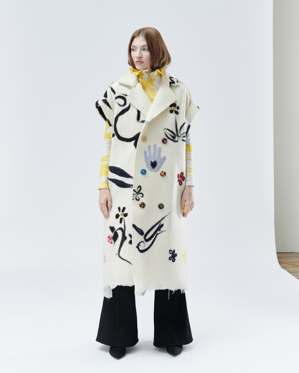 Tereza Rosalie Kladošová is known for her collections full of colours, patterns, and various combinations. She works with new materials created from merino wool waste. She will be represented at the Prague House by a unique, completely handmade felt design, The Vest Unicorns, full of symbols that remind the artist of home.