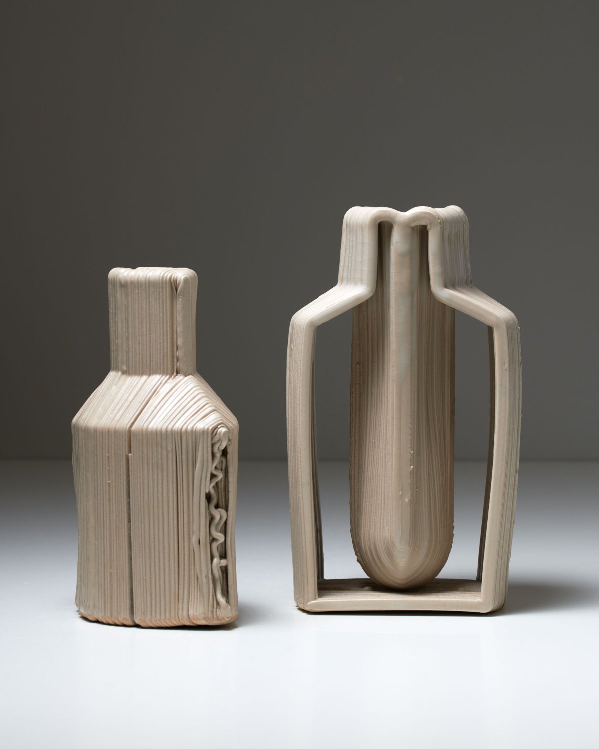 Karolína Vintrová's Temple vases were created using the technique of 3D printing ceramic clay. They are horizontally printed in two pieces, then glued together. Thanks to this, the double-walled vases can also be used upside down. Karolina layered the material according to construction principles of Gothic refracted arches, which coincide with the principle of using vertical and horizontal lines in 3D printing.