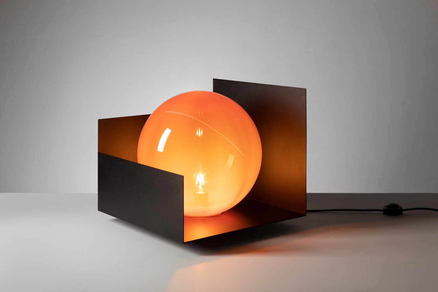 Tomáš Kučera draws on the use of basic geometric shapes in modernist art. The design of the Phases Floor lamp, using a mechanical cube shade, also brings the principle of rotation, which is often repeated in the production of glass products. An incomplete, black cube rotates around a glass sphere. On it, other geometric objects are displayed utilizing a grinding wheel, which are highlighted when the light source is lit.